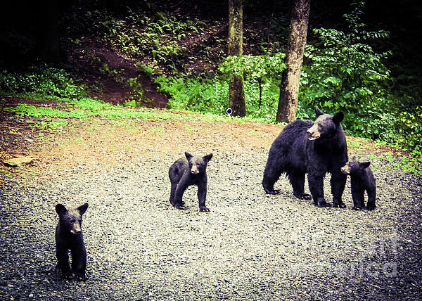 This photograph was taken by my husband outside our cabin in the North GA mountains. This Mama Black Bear and her three baby cubs arrived for dinner as they smelled spaghetti sauce cooking inside the cabin. Black bear regularly visit our little valley in the mountains and it is a pleasure to observe them in their habitat. Please know that the FAA watermark will not appear on any prints.